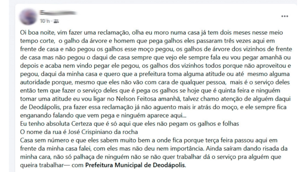 Indignada com a situação, ela cobra providências da Prefeitura Municipal de Deodápolis e pede que as autoridades fiscalizem o serviço. Segundo seu desabafo, até mesmo ao abordar os funcionários pessoalmente, ela foi ignorada e até ridicularizada.