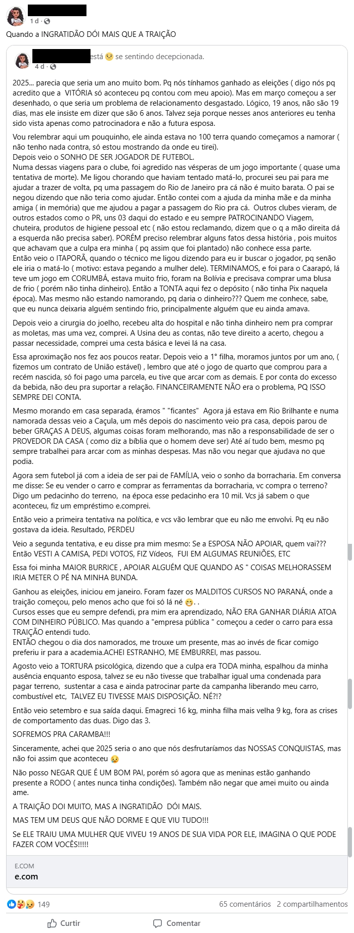 No post, a mulher escreve que, em março de 2025, começaram a se desenhar problemas no relacionamento, caracterizados por desgaste. Ela relata que, ao longo dos anos, ajudou o vereador financeiramente, inclusive quando ele tentou seguir carreira como jogador de futebol sem sucesso.